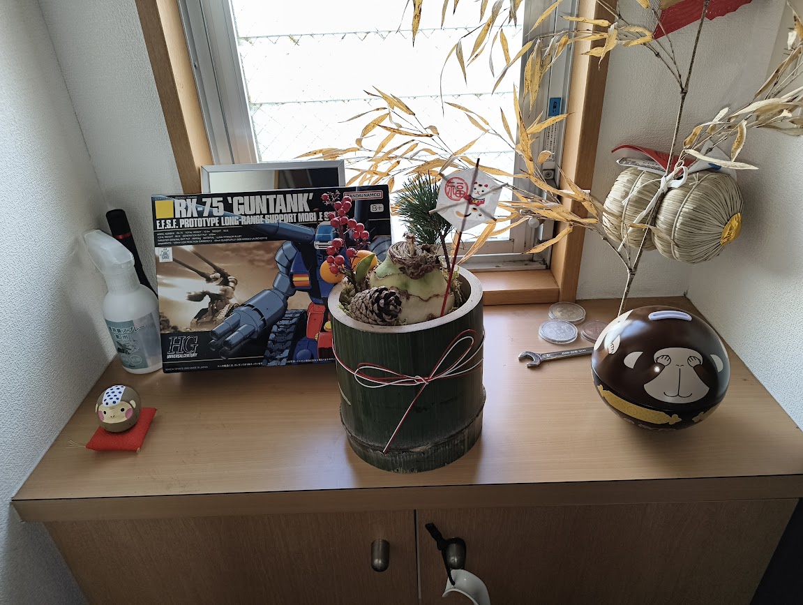 そこで近くの生花店に何か良いものがないか店員さんに聞くと、マジックアマリリスとか言う水やりが要らない観葉植物(お正月仕様)を進められ、一目でお気に入り。これを門松に見立てて置くことに。あとは(たまたま)見かけたネット記事にあやかって元旦ク(ガンタンク)を並べて飾り付け。本当はガンプラを組みたかったけど諸事情で断念。新年の忙しさが落ち着いたら今年第一号のプラモとして素組みしたいな~と思案中。